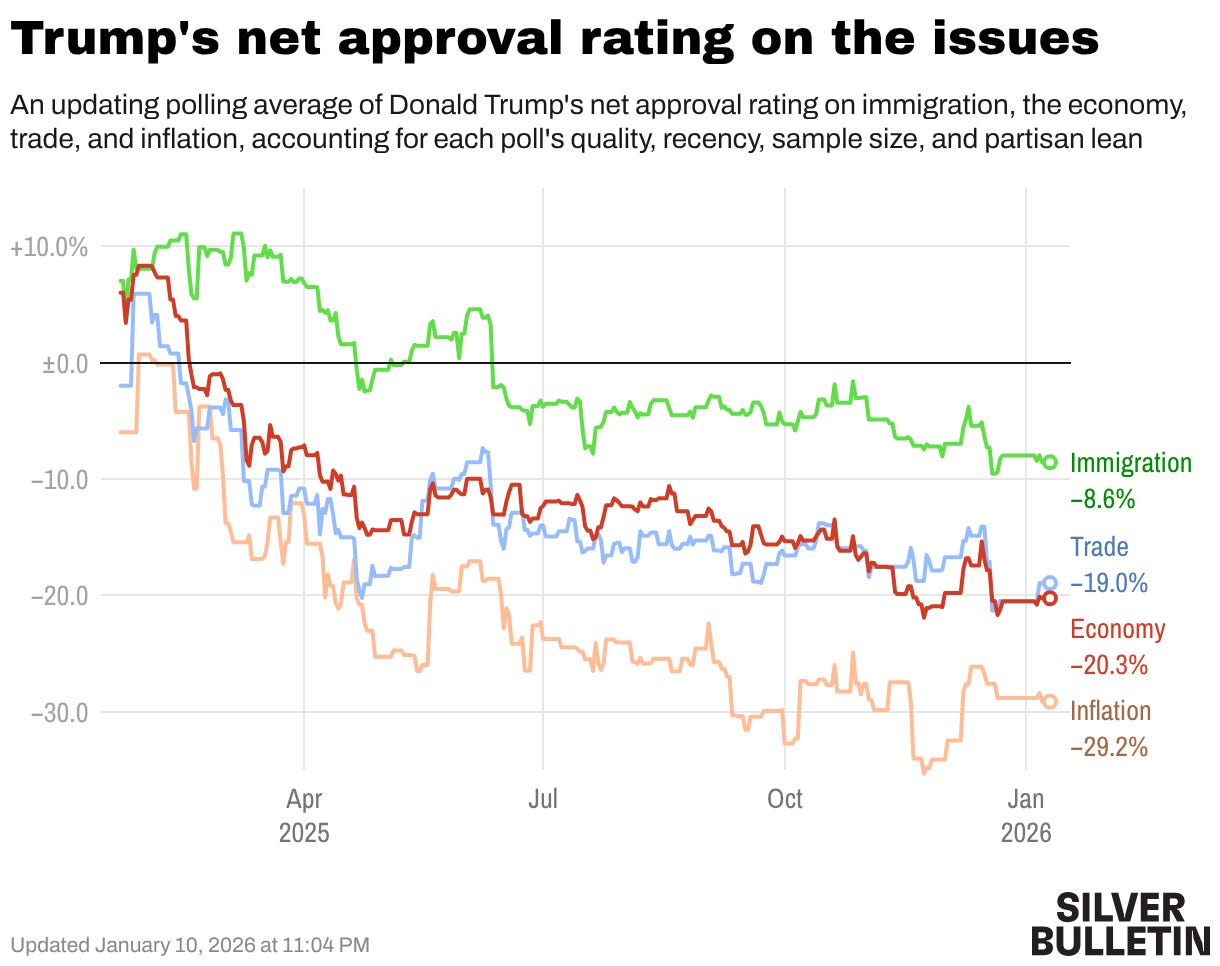 Y tiene todas las de perder. Por una parte, su valoración en las encuestas está en caída libre entre todos los votantes, también los del Partido Republicano. Su gestión tiene una percepción negativa en todos los grandes temas (inmigración, economía, comercio e inflación). Y su imagen se está deteriorando entre unos votantes que son cruciales y que ya le dieron la victoria en 2024: los de clase trabajadora.
